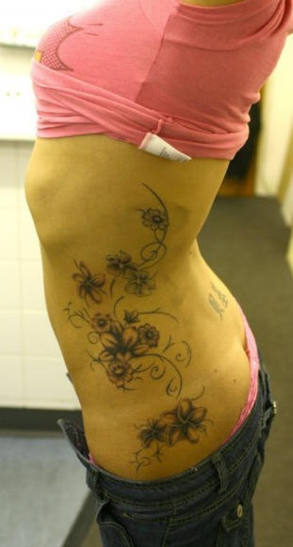 女性腰侧彩色花藤纹身图案