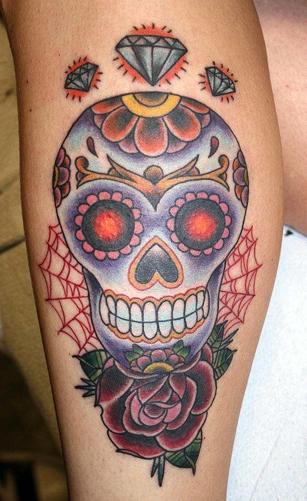 手臂彩色sugar 骷髅玫瑰和钻石纹身图案