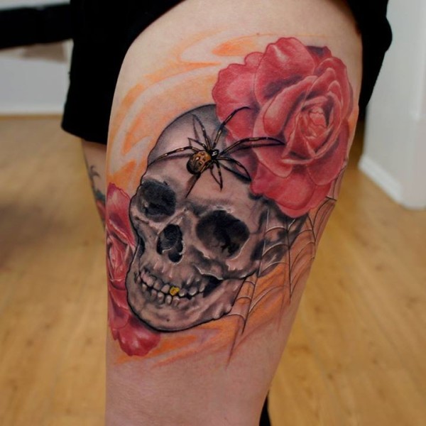 腿部彩色人类头骨和蜘蛛结合纹身图案