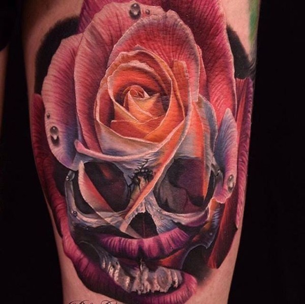 现代传统风格的彩色骷髅与玫瑰纹身图案