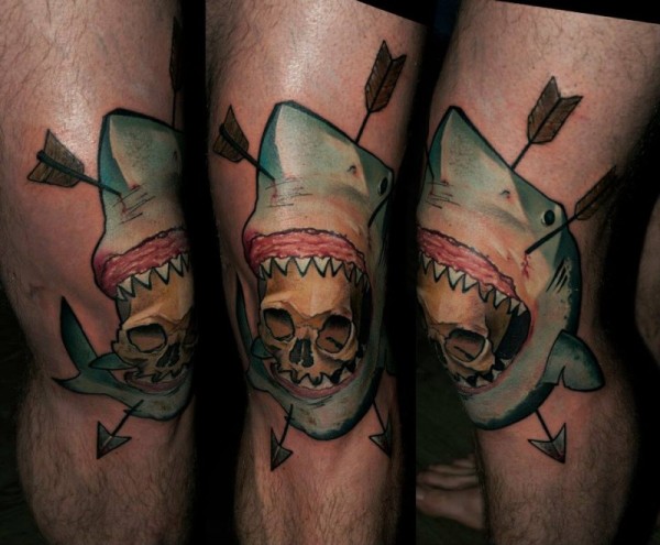 新传统彩色膝盖鲨鱼与箭头纹身图案
