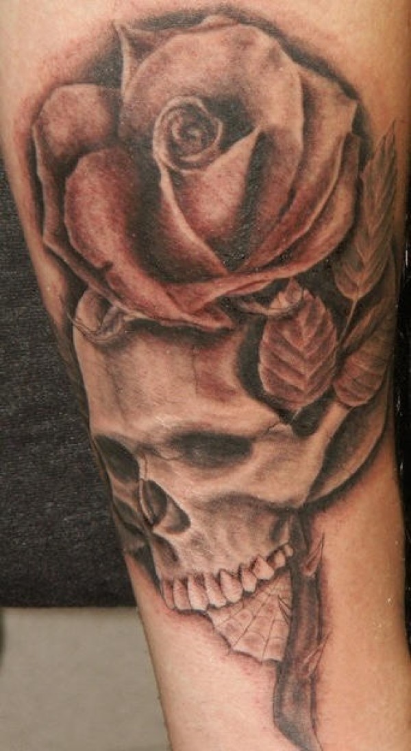 肩部棕色玫瑰和骷髅纹身图案