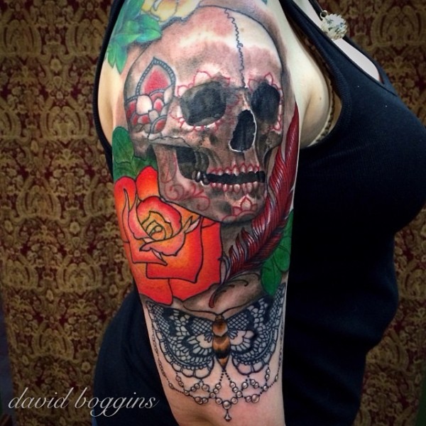 肩部水彩色的骷髅和玫瑰纹身图案