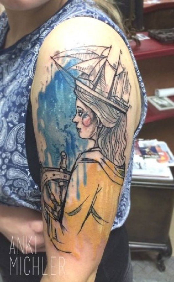 素描式彩色肩纹身的妇女与帆船纹身图案