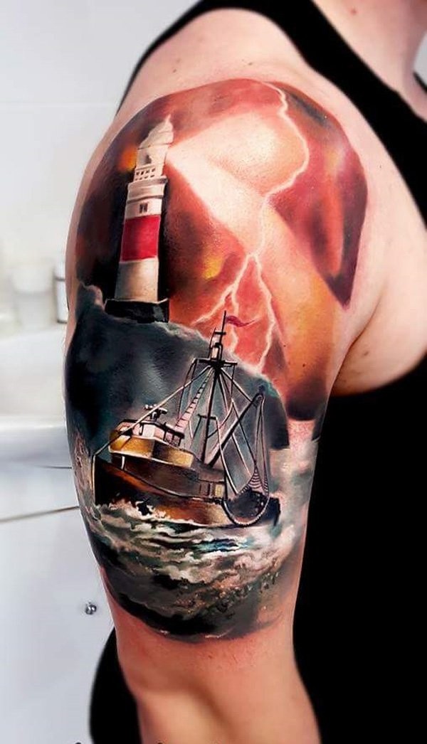 肩部彩色海上帆船纹身图案