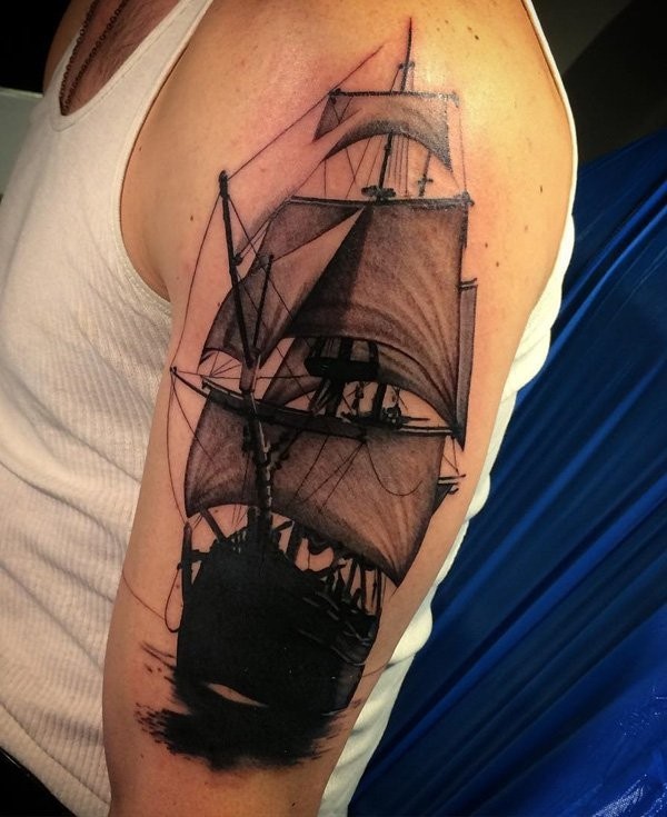 男性肩部黑灰大型帆船纹身图案