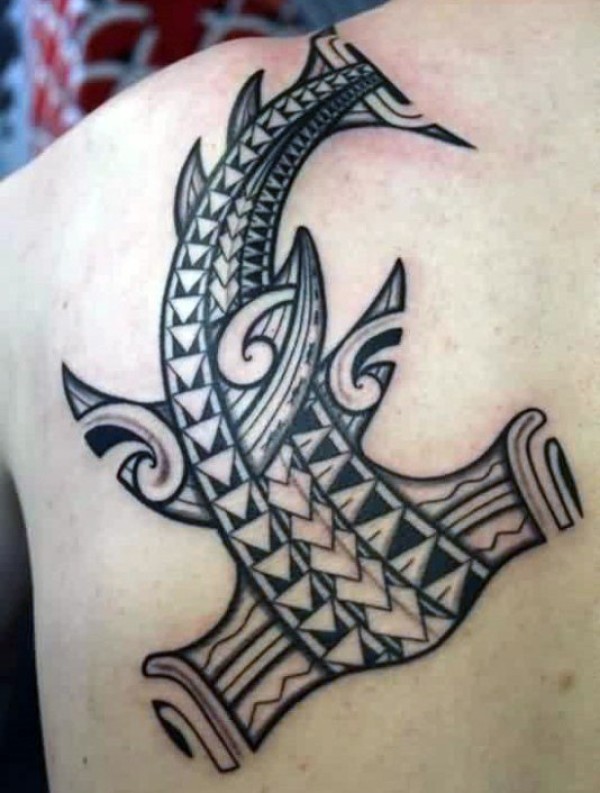 肩部黑色令人惊叹的锤头鲨纹身图片
