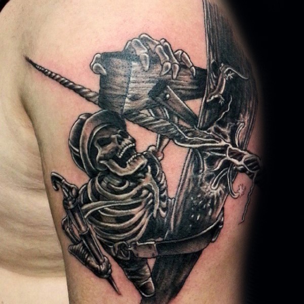 肩部黑白插画风格骷髅纹身图案