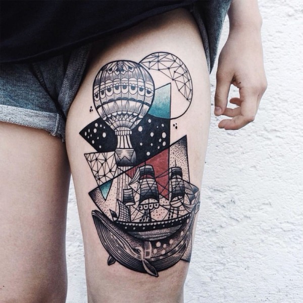 旧货风格的彩色鲸鱼与船舶纹身图案
