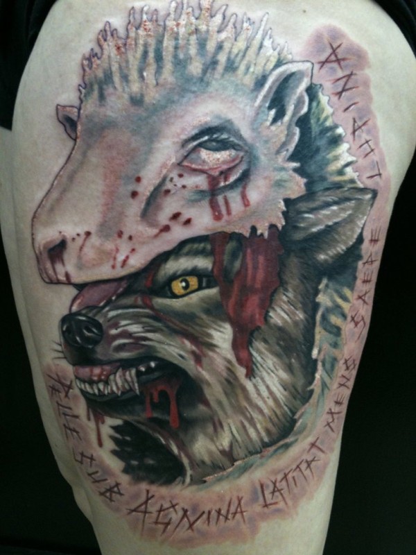 令人毛骨悚然的彩色血腥狼装羊纹身图案