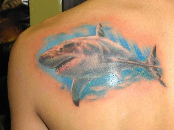 男性肩刃上的彩色鲨鱼纹身图案