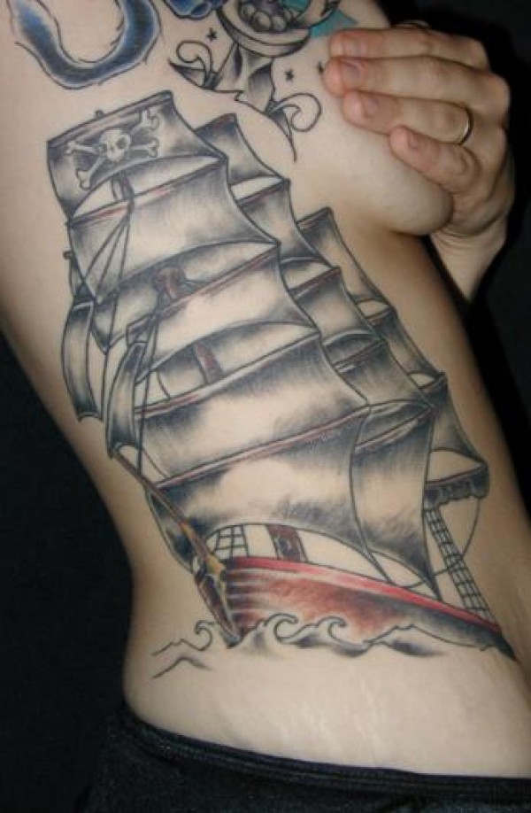 腰侧传统素描风船舶纹身图案