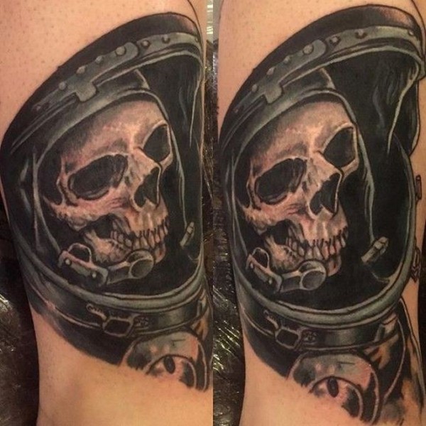 旧货风格的黑棕色宇航员骷髅纹身图案