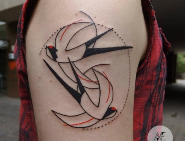 肩部简约飞行鸟彩色纹身图案