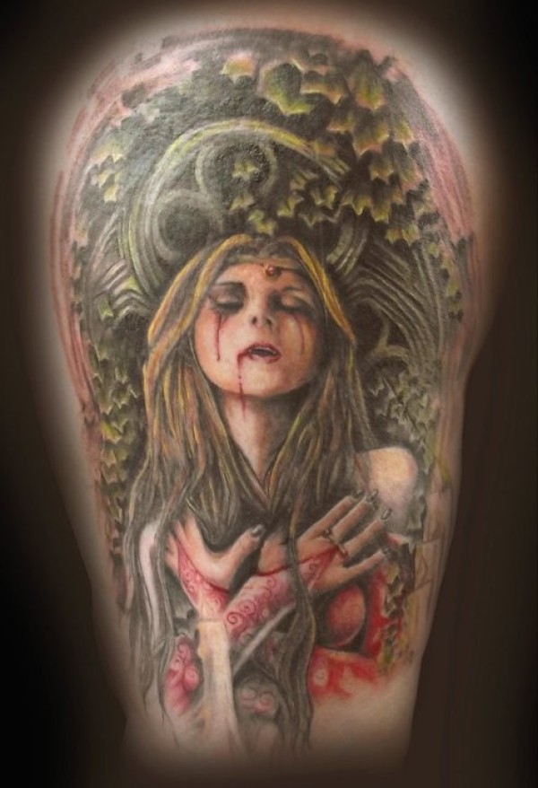 肩部令人毛骨悚然的彩色血腥吸血鬼纹身图案