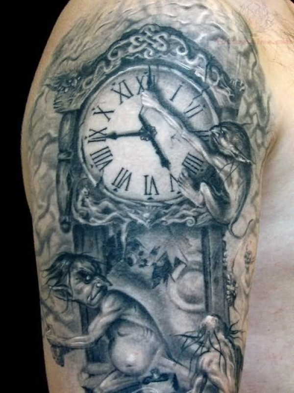 肩部黑灰色洗涤风格时钟与恶魔纹身图案