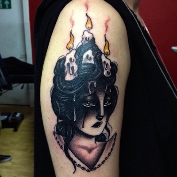 肩部彩色女人头部燃烧的蜡烛纹身图案