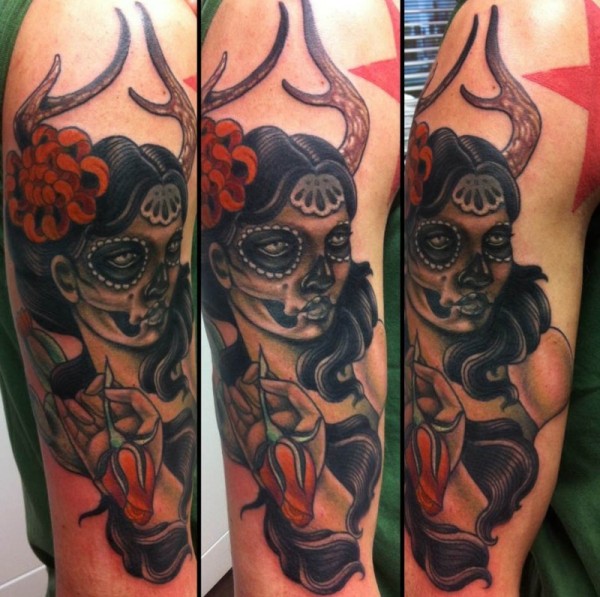 肩部新风格的彩色妇女与角纹身图案