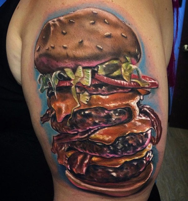 肩部彩色现实主义风格巨大的汉堡纹身图案