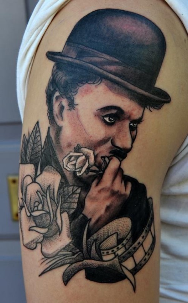 肩部黑棕色雕刻人物与玫瑰纹身图案
