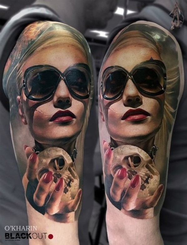 现实主义风格的彩色肩纹身的妇女纹身图片