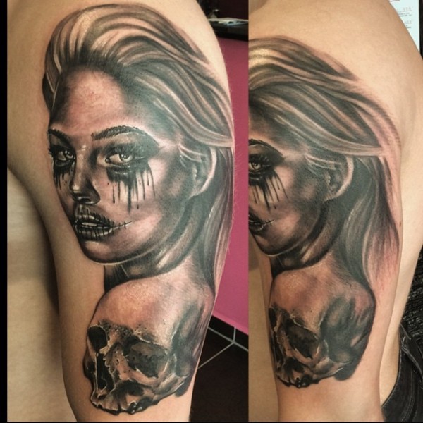 新风格的黑棕色肩膀哭泣的女人纹身图案