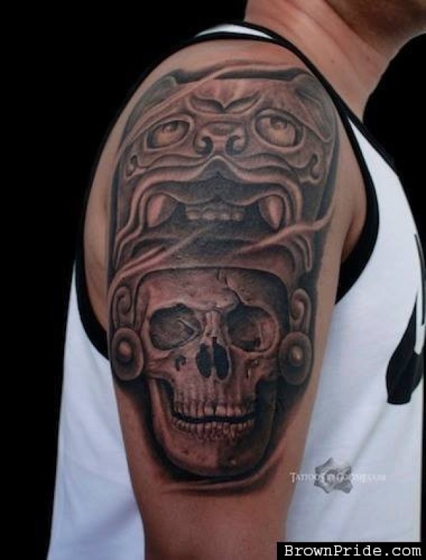 肩部石雕风格恶魔的头盔骷髅纹身图片