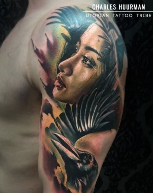 难以置信的彩色肩部妇女与乌鸦纹身图片