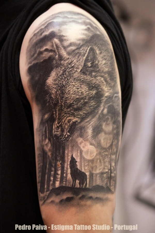 肩部黑灰色水洗式森林狼纹身图案