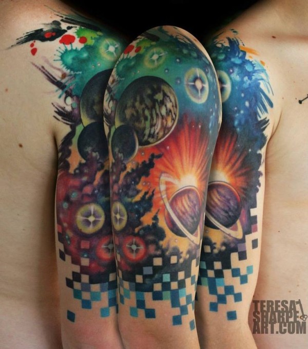 肩部彩色太空太阳系纹身图片