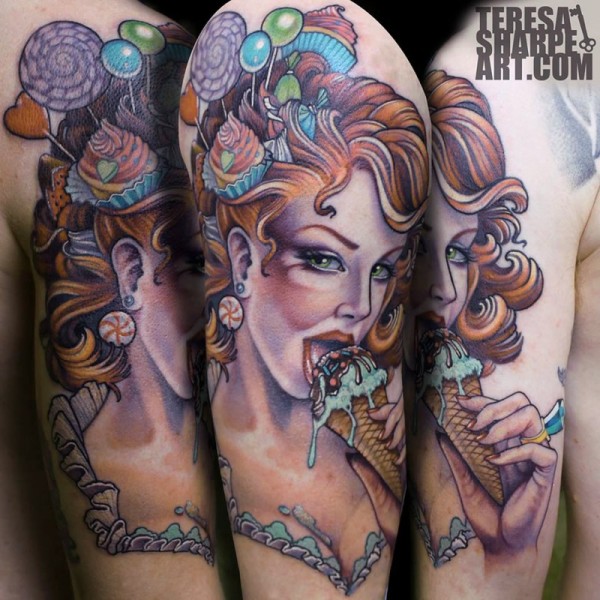 肩部复古风彩色诱人的女人与冰淇淋纹身图案
