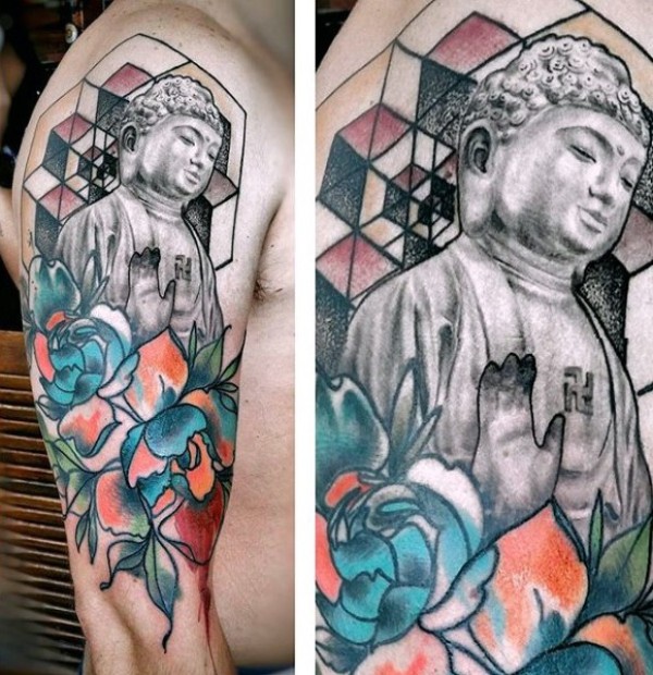肩部有趣的半彩色如来佛祖雕像纹身图案