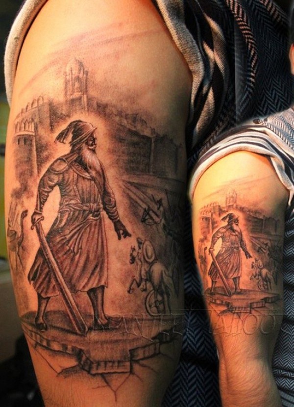 肩部棕色战士在攻击城堡纹身图案