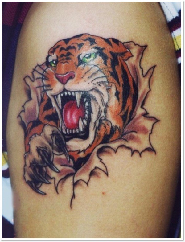 肩部撕皮彩色老虎头纹身图案