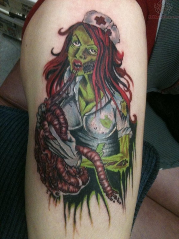 老卡通风格的彩绘血腥僵尸护士纹身图案