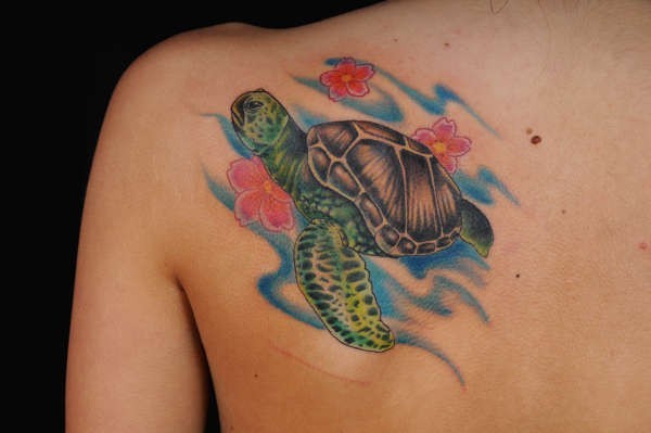 肩部彩色花和海龟纹身图案