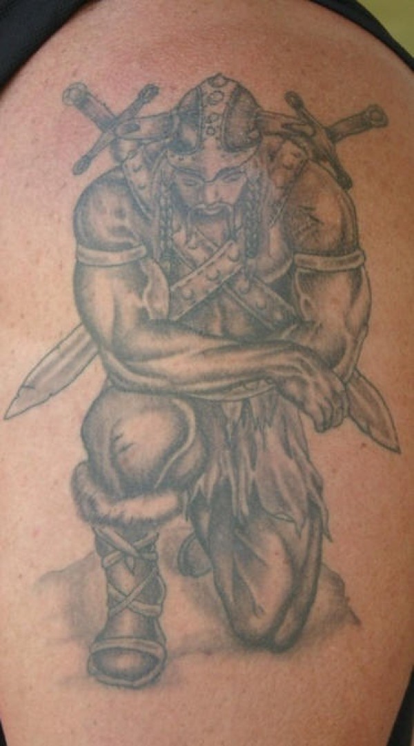 肩部黑灰悲伤的战士跪地纹身图案