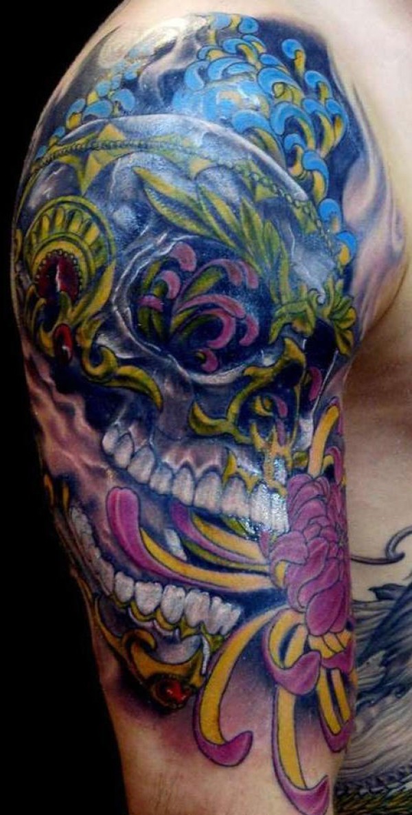 伪装在鲜花中的骷髅头纹身图案