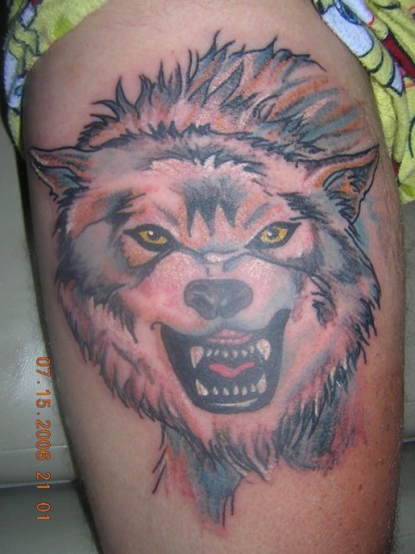 肩部彩色愤怒的狼头纹身图案