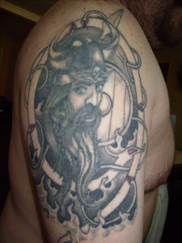 肩部黑灰维京少年纹身图案