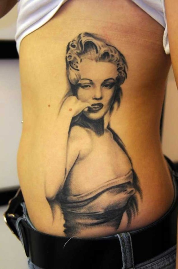 腰侧黑白欧美女人纹身图案