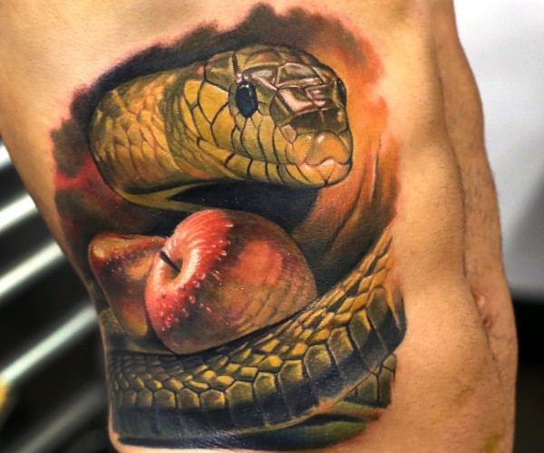 现实主义风格的彩色腰侧蛇纹身图案