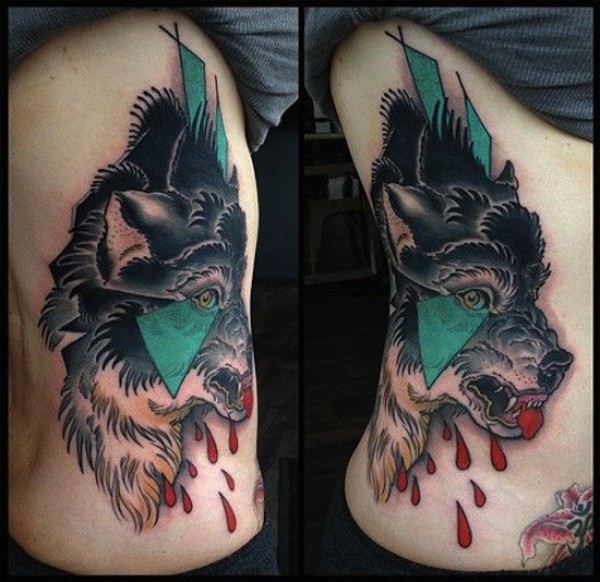 现代传统风格的彩色腰侧血腥狼纹身图案
