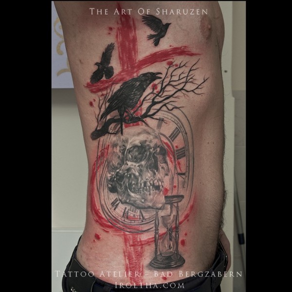 腰侧现代风彩色骷髅头与乌鸦纹身图案