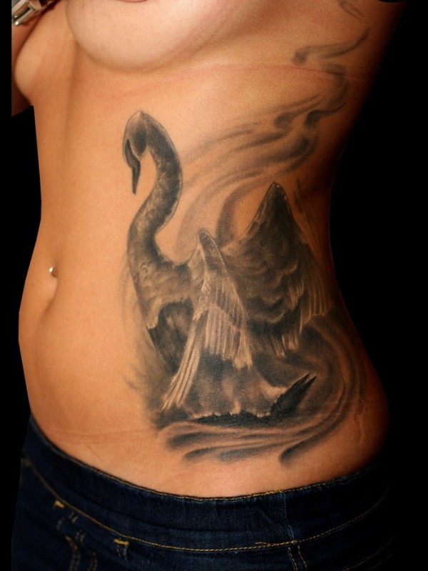 腰部黑灰墨水天鹅纹身图案