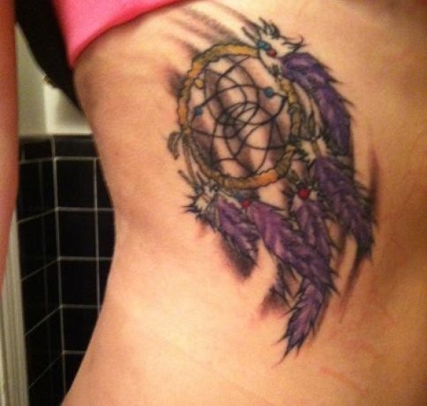 女性腰侧彩色捕梦网纹身图案