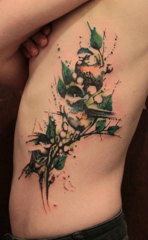 腰侧水彩色树上的鸟纹身图案