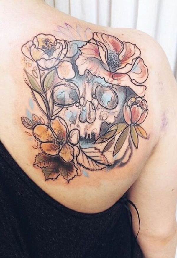 肩部彩色素描风格骷髅与鲜花纹身图案