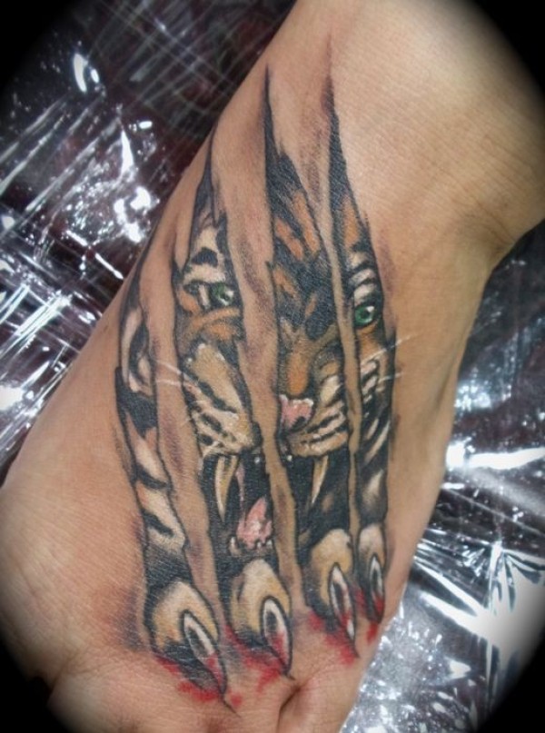 脚部彩色老虎撕皮纹身图案