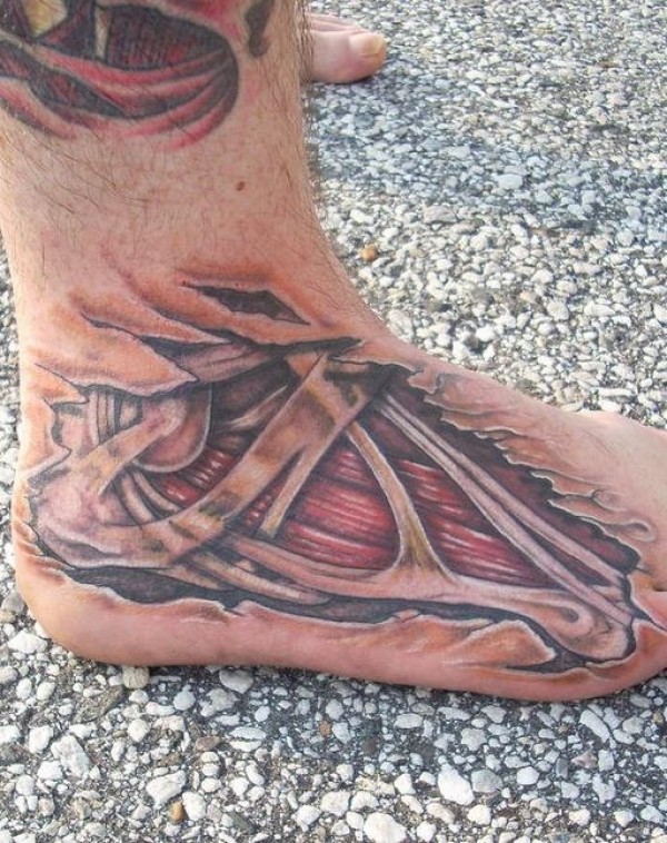 脚部彩色肉和骨头撕裂纹身图案